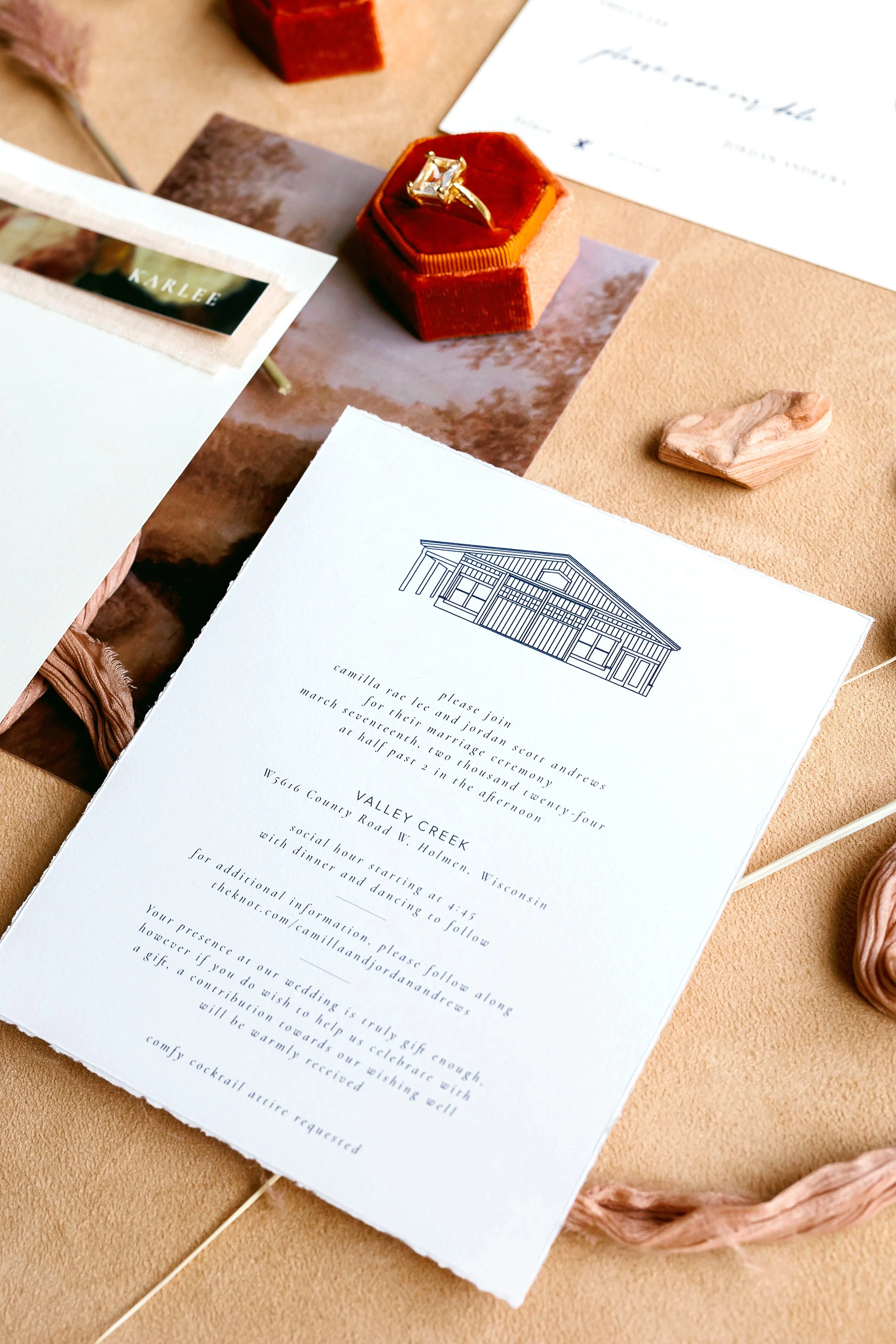 The main invitation is what we consider the star of the show. Often we create the rest of your pieces off this design. The invitation is a timepiece and is what your guests will keep long term